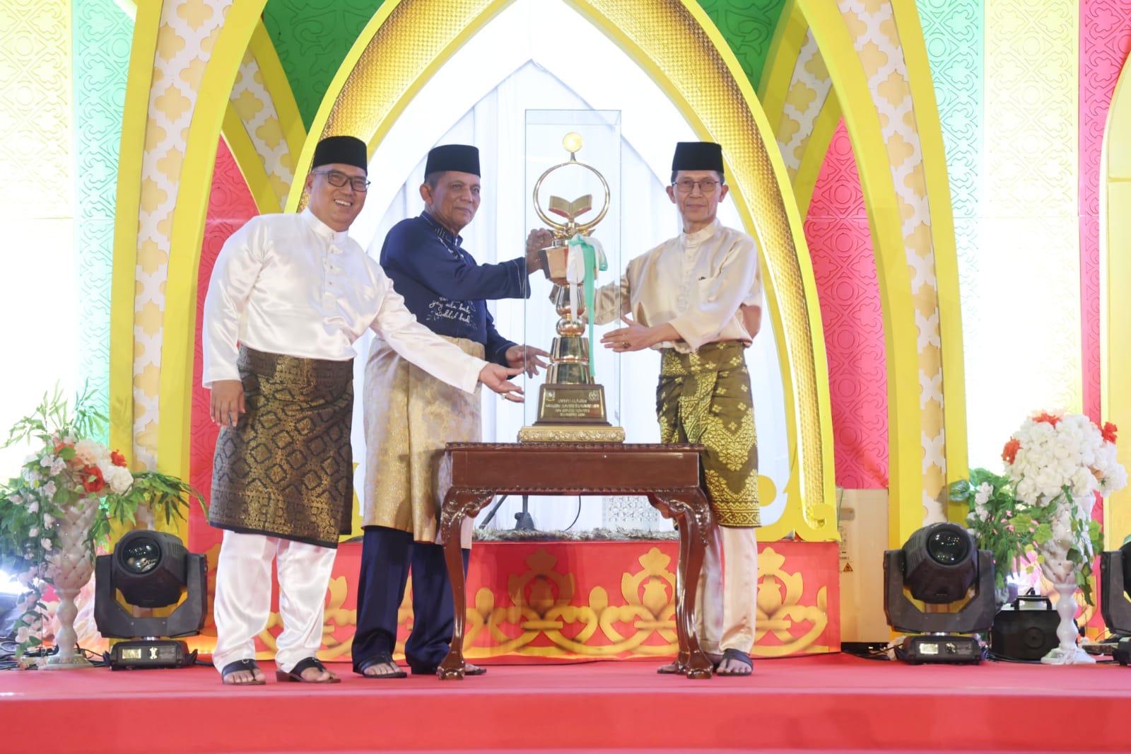 Walikota Batam Amsakar Achmad menerima piala bergilir STQH Provinsi Kepri diserahkan Gubernur Ansar Ahmad didampingi Nyanyang Haris Pratamura selaku Ketua Umum LPTQ.