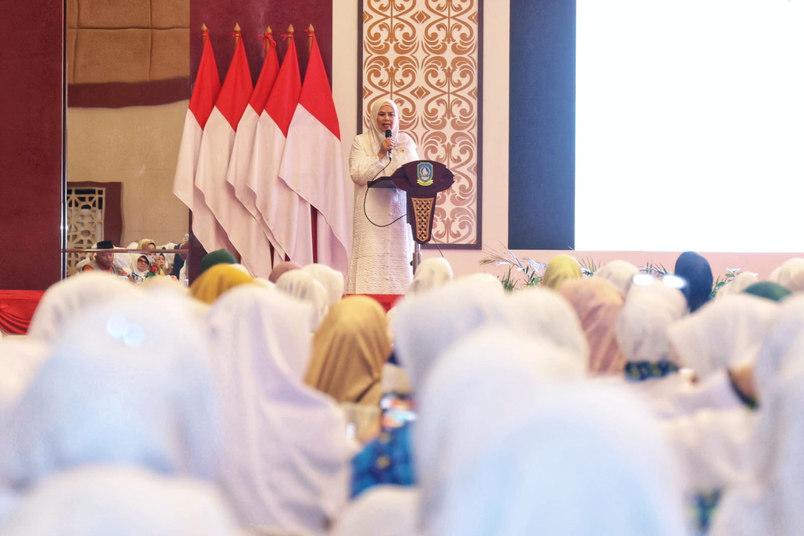 Ketua BKMT Kepri, Hj Dewi Kumalasari Ansar memberikan kata sambutan. (Enji/DISKOMINFO KEPRI)