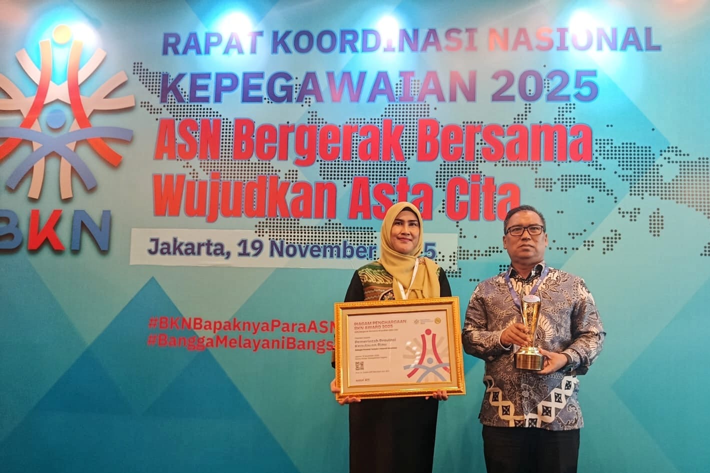 Penghargaan diberikan kepada Pemprov Kepri dalam ajang BKN Award 2025 yang disejalankan dengan Rakornas Kepegawaian Tahun 2025 diselenggarakan Badan Kepegawaian Nasional di Ballroom Hotel Pullman, Jakarta, Rabu (19/11/2025).
