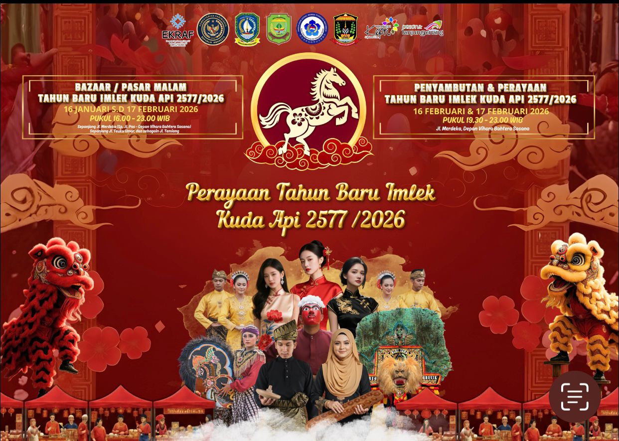 DISKOMINFO KEPRI - Menjelang perayaan Tahun Baru Imlek Kuda Api 2557 yang akan jatuh pada 17 Februari 2026, Paguyuban Sosial Marga Tionghoa Indonesia (PSMTI) Kota Tanjungpinang – Bintan berkolaborasi dengan Dinas Pariwisata Provinsi Kepulauan Riau serta Dinas Kebudayaan & Pariwisata Kota Tanjungpinang menggelar kegiatan Bazar Imlek atau Pasar Malam. Kegiatan ini dijadwalkan berlangsung di Jalan Merdeka – Teuku Umar, Kawasan Kota Tua Tanjungpinang, mulai 16 Januari hingga 17 Februari 2026.