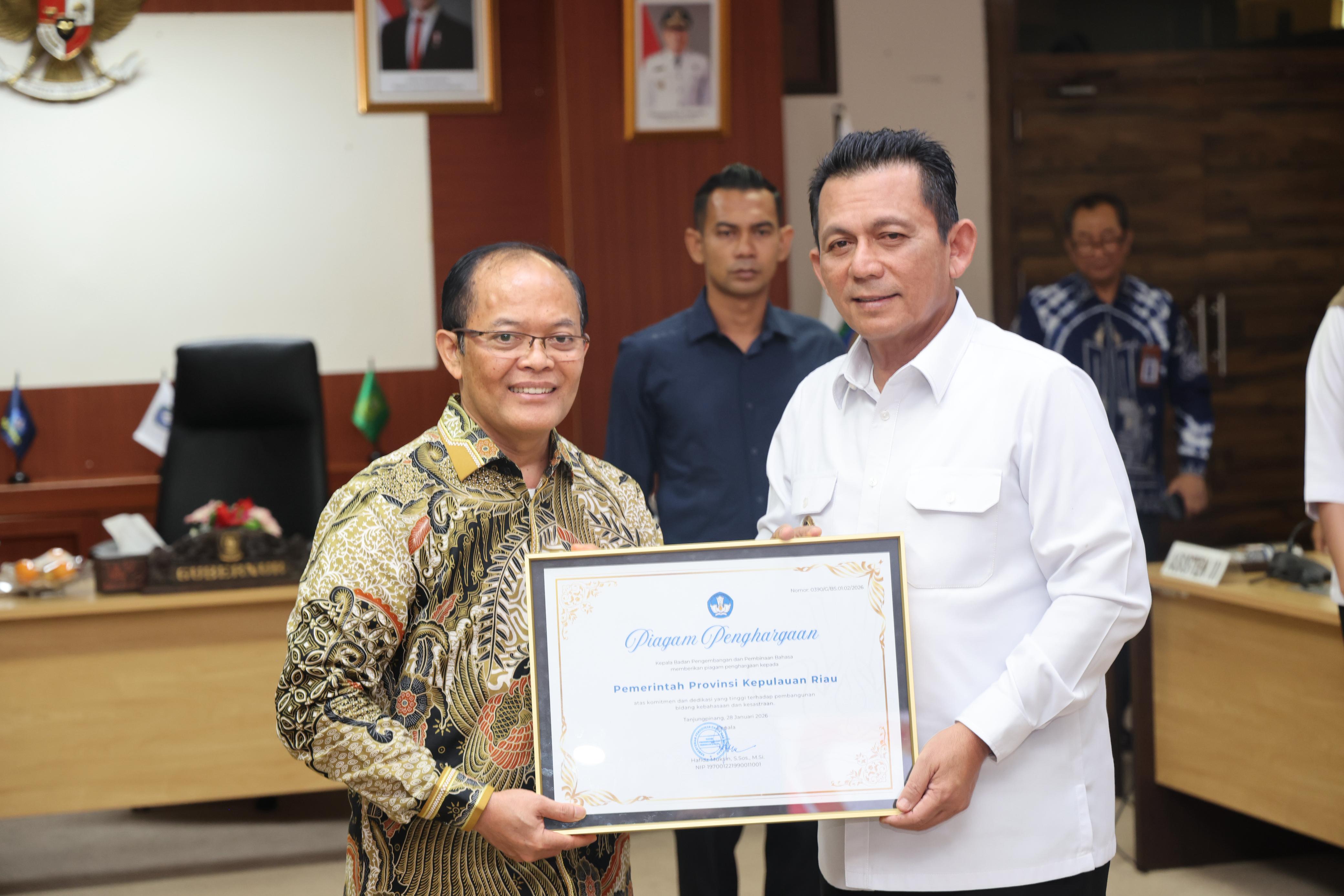 DISKOMINFO KEPRI - Gubernur Kepulauan Riau Ansar Ahmad mempertegas komitmennya dalam memperkuat penggunaan bahasa Indonesia di Provinsi Kepulauan Riau dengan menandatangani Nota Kesepakatan dan Rencana Kerja Sama antara Pemerintah Provinsi Kepulauan Riau dengan Badan Pengembangan dan Pembinaan Bahasa. Penandatanganan tersebut dilakukan Gubernur Ansar bersama Kepala Badan Pengembangan dan Pembinaan Bahasa Hafidz Muksin di Ruang rapat Balairung Raja Ali Kelana Kantor Gubernur Kepri, Tanjungpinang, Rabu (28/01/2026).