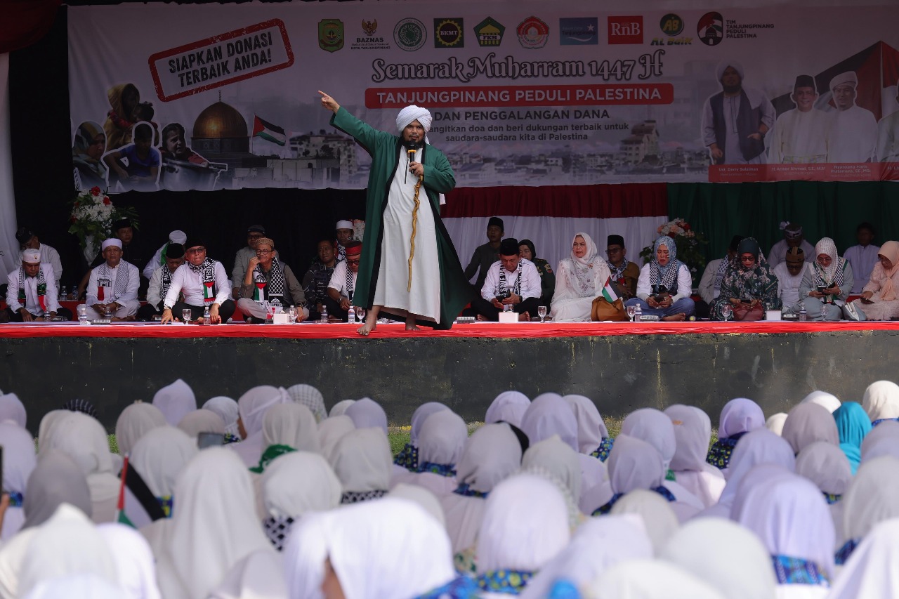DISKOMINFO KEPRI - Ribuan warga Tanjungpinang memadati Lapangan Pamedan untuk mengikuti acara Semarak Muharram 1447 H yang dirangkaikan dengan Tabligh Akbar dan Penggalangan Dana Peduli Palestina, Minggu (20/7). Acara sosial kemanusiaan ini dihadiri langsung oleh Gubernur Kepulauan Riau H. Ansar Ahmad.
