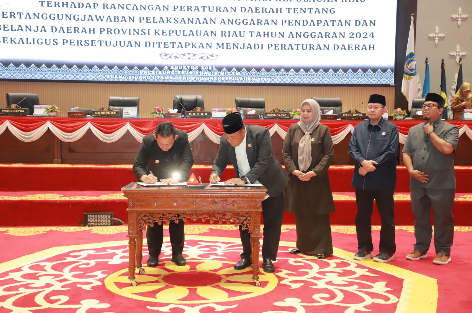 Penandatanganan persetujuan bersama dilakukan oleh Gubernur Kepulauan Riau H. Ansar Ahmad dan pimpinan DPRD Kepri sebagai tanda sahnya pengesahan LPJ tersebut.
