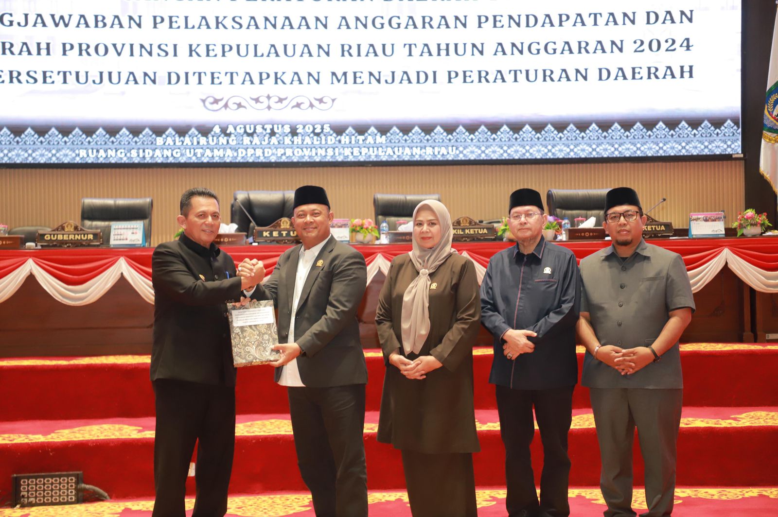 DISKOMINFO KEPRI — DPRD Provinsi Kepulauan Riau secara resmi menetapkan Rancangan Peraturan Daerah (Ranperda) tentang Laporan Pertanggungjawaban Pelaksanaan Anggaran Pendapatan dan Belanja Daerah (LPJ APBD) Tahun Anggaran 2024 menjadi Peraturan Daerah (Perda). Penetapan dilakukan dalam Rapat Paripurna DPRD Kepri di Ruang Sidang Utama Kantor DPRD Kepri, Dompak, Senin (4/8).