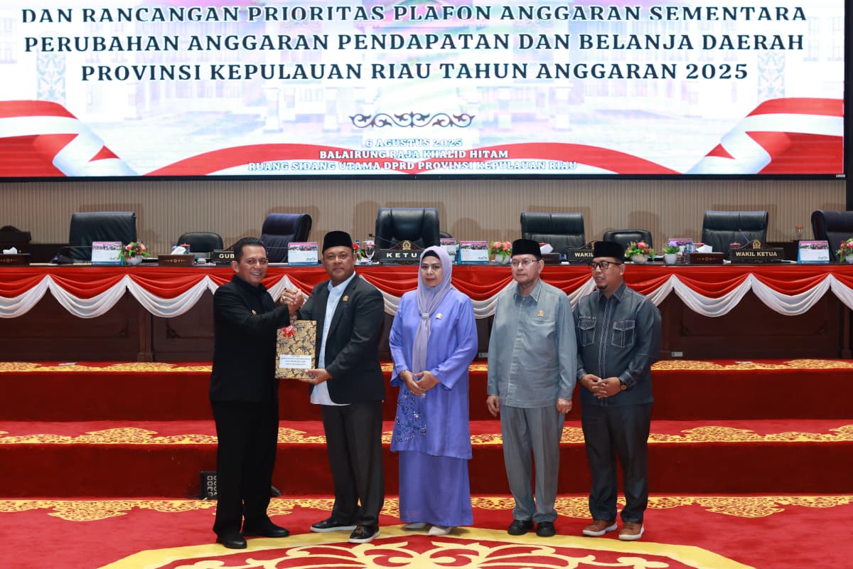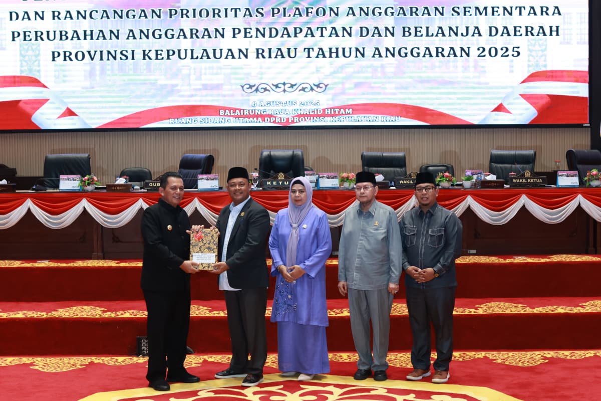 DISKOMINFO KEPRI – Gubernur Kepulauan Riau, H. Ansar Ahmad, menyampaikan Rancangan Kebijakan Umum Anggaran serta Rancangan Prioritas dan Plafon Anggaran Sementara (KUA dan PPAS) Perubahan APBD Provinsi Kepulauan Riau Tahun Anggaran 2025 dalam rapat paripurna yang digelar di Ruang Sidang Utama DPRD Provinsi Kepri, Balairung Raja Khalid, Rabu (6/8/2025). Rapat dipimpin langsung oleh Ketua DPRD Kepri, Iman Sutiawan, dan dihadiri para pimpinan dan anggota dewan, Forkopimda, serta jajaran Pemerintah Provinsi Kepri.