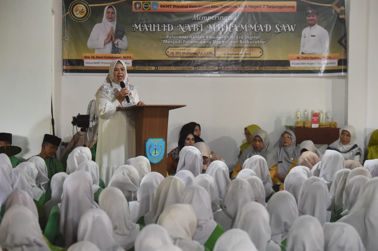 Dalam sambutannya, Ketua BKMT Kepulauan Riau, Dra. Hj. Dewi Kumalasari Ansar, menyambut baik peringatan Maulid Nabi Muhammad SAW di lingkungan SMA Negeri 7 Tanjungpinang ini.