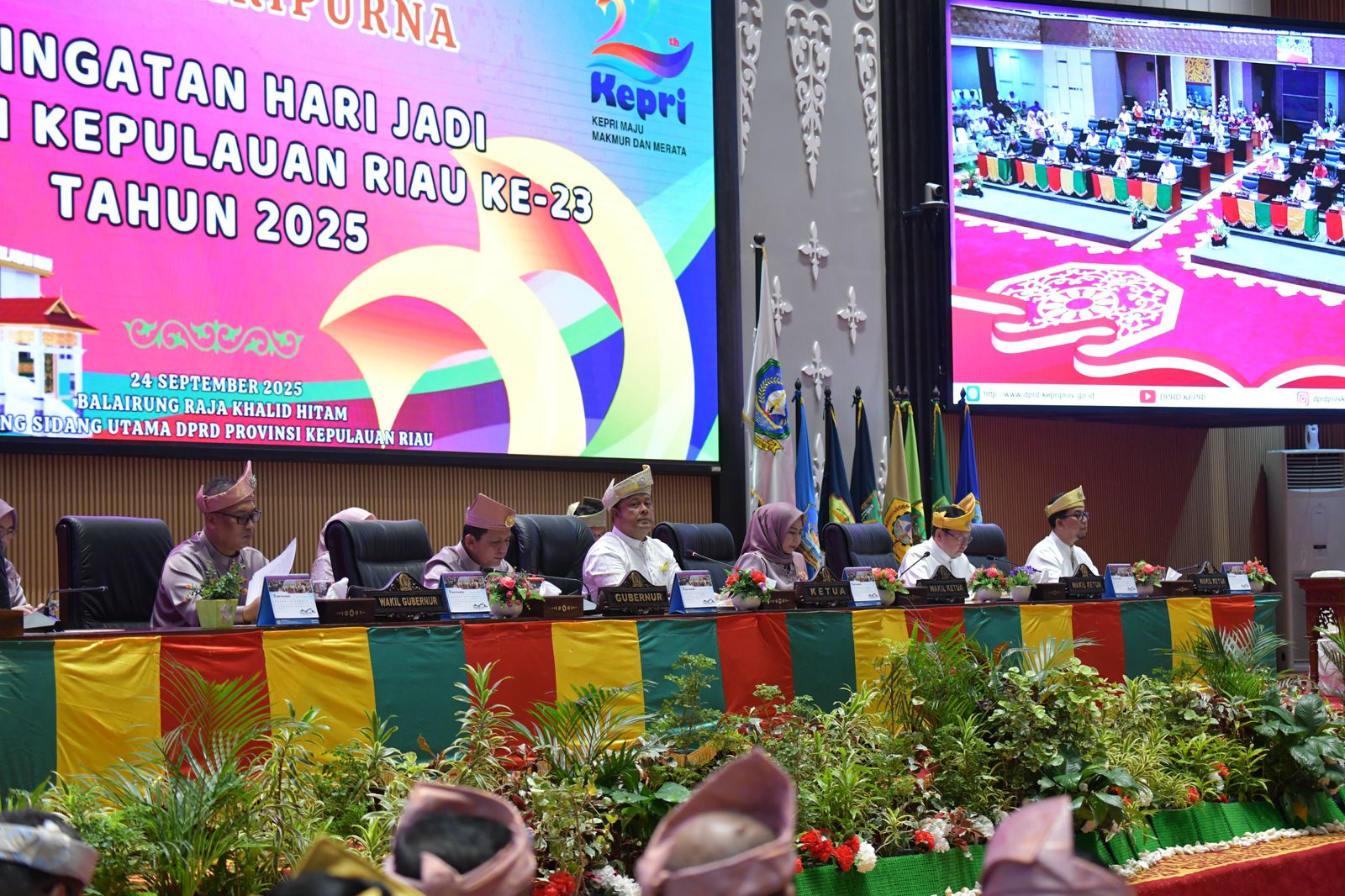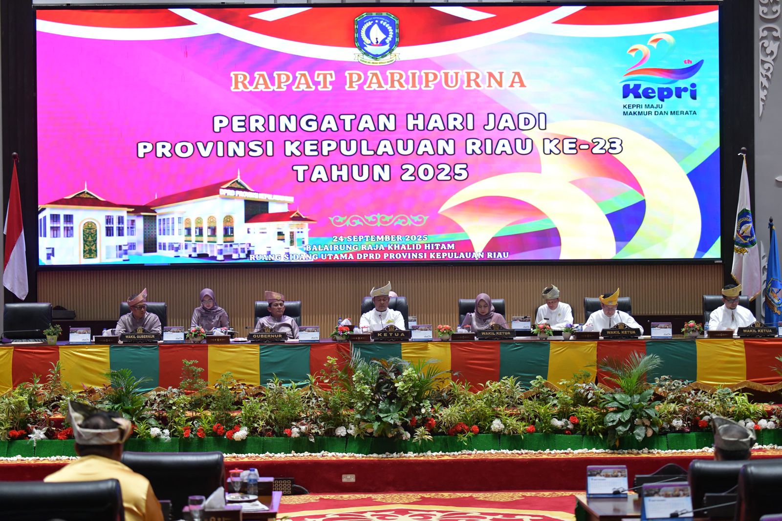 DISKOMINFO KEPRI – DPRD Provinsi Kepulauan Riau menggelar Rapat Paripurna dalam rangka memperingati Hari Jadi ke-23 Provinsi Kepulauan Riau di Ruang Rapat Utama DPRD, Rabu (24/9). Sidang paripurna dipimpin Ketua DPRD Kepri Iman Sutiawan, dihadiri Gubernur Kepri H. Ansar Ahmad, Wakil Gubernur Nyanyang Haris Pratamura beserta Ketua BKOW Nenny Dwiyana Nyanyang, serta jajaran Forkopimda, tokoh masyarakat, dan undangan lainnya.