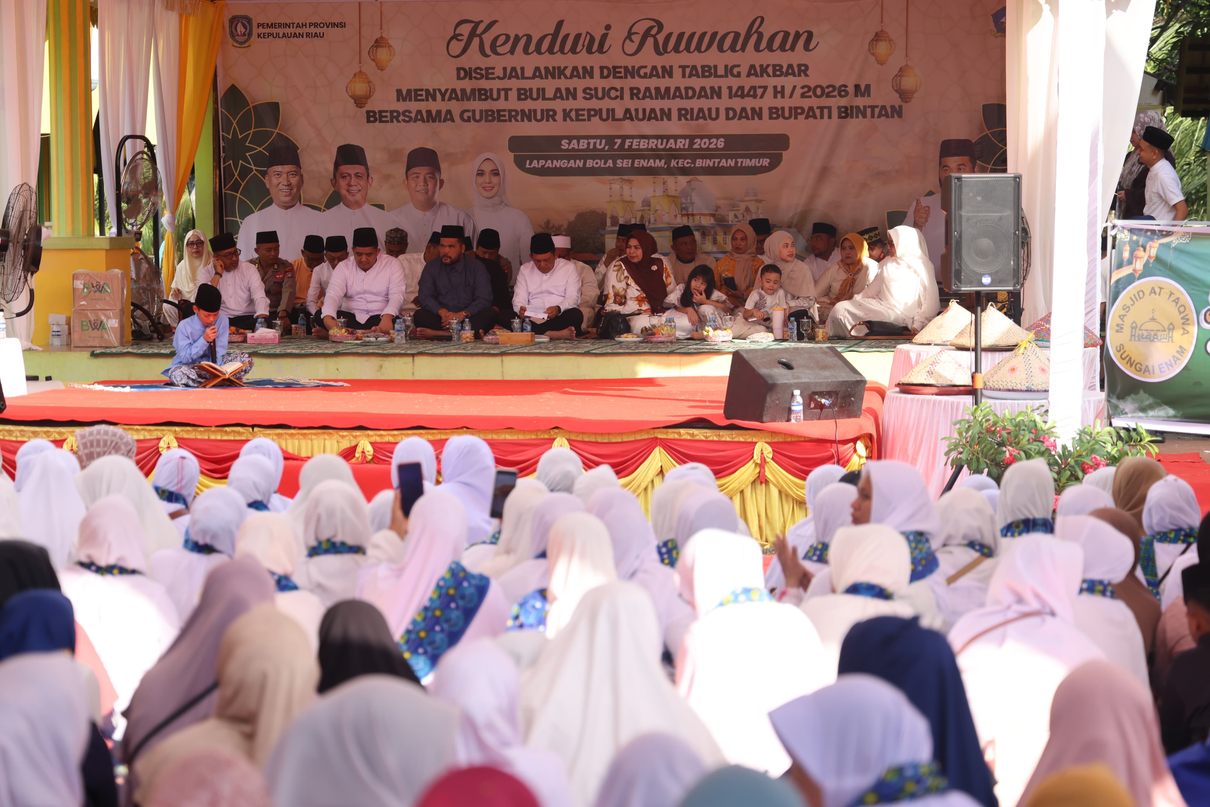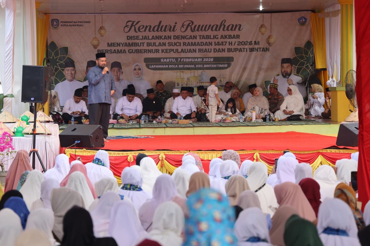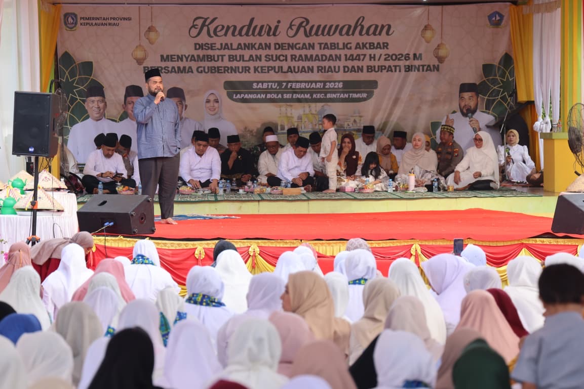 DISKOMINFO KEPRI - Gubernur Kepulauan Riau Ansar Ahmad menghadiri acara Kenduri Ruwahan dan Tabligh Akbar yang diselenggarakan Pemerintah Kabupaten Bintan untuk menyambut Bulan Suci Ramadan 1447 H / 2026 M. Kegiatan ini berlangsung khidmat di Lapangan Bola Sei Nam, Kijang, Kecamatan Bintan Timur, pada Sabtu (7/2/2026), dihadiri ribuan masyarakat setempat serta tokoh agama dan pemerintahan.