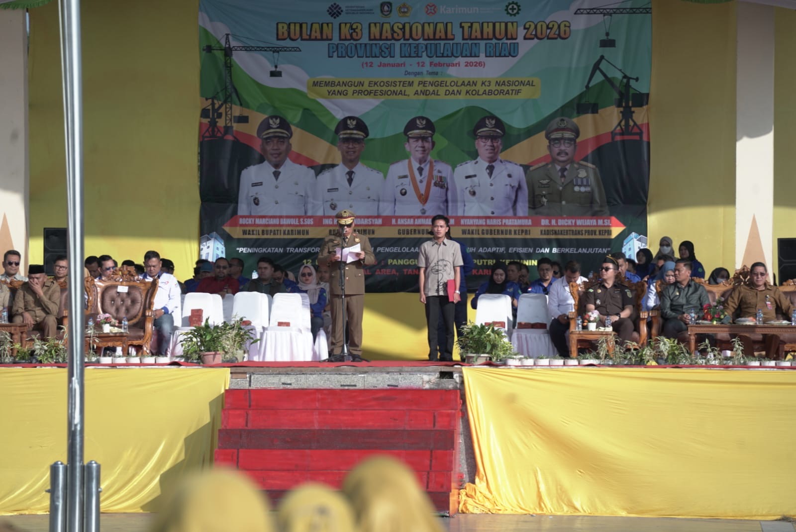 DISKOMINFO KEPRI - Wakil Gubernur Provinsi Kepulauan Riau, Nyanyang Haris Pratamura, menjadi inspektur upacara pada Apel Bersama Peringatan Bulan Keselamatan dan Kesehatan Kerja (K3) Nasional ke-56 Tahun 2026 yang digelar di Panggung Sri Kemuning, Coastal Area, Karimun, Senin (9/2/2026).