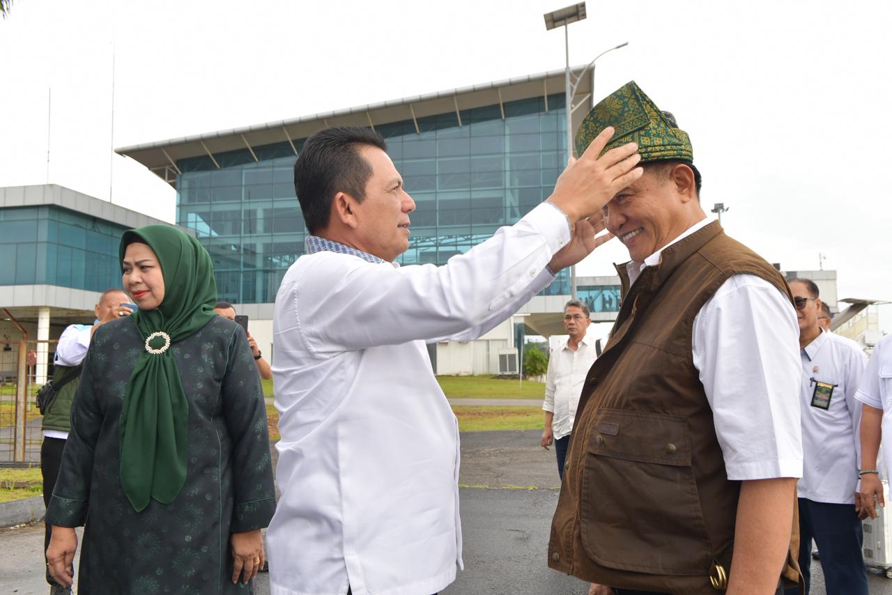 Penyambutan berlangsung hangat dan penuh keakraban, ditandai dengan pemasangan tanjak khas Melayu kepada Menko Yusril sebagai simbol penghormatan adat bagi tamu kehormatan yang datang ke Bumi Segantang Lada.