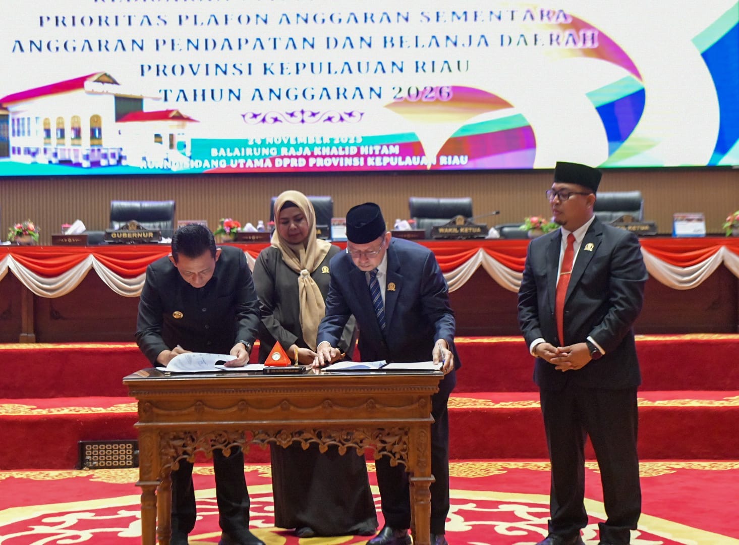 DISKOMINFO KEPRI - Pemerintah Provinsi Kepulauan Riau bersama DPRD Kepri resmi menyepakati Kebijakan Umum Anggaran (KUA) dan Prioritas Plafon Anggaran Sementara (PPAS) Tahun Anggaran 2026. Kesepakatan tersebut ditandai dengan penandatanganan Nota Kesepakatan Bersama dalam Rapat Paripurna yang digelar di Ruang Sidang Utama Balairung Raja Khalid Hitam, Dompak, Senin (24/11).
