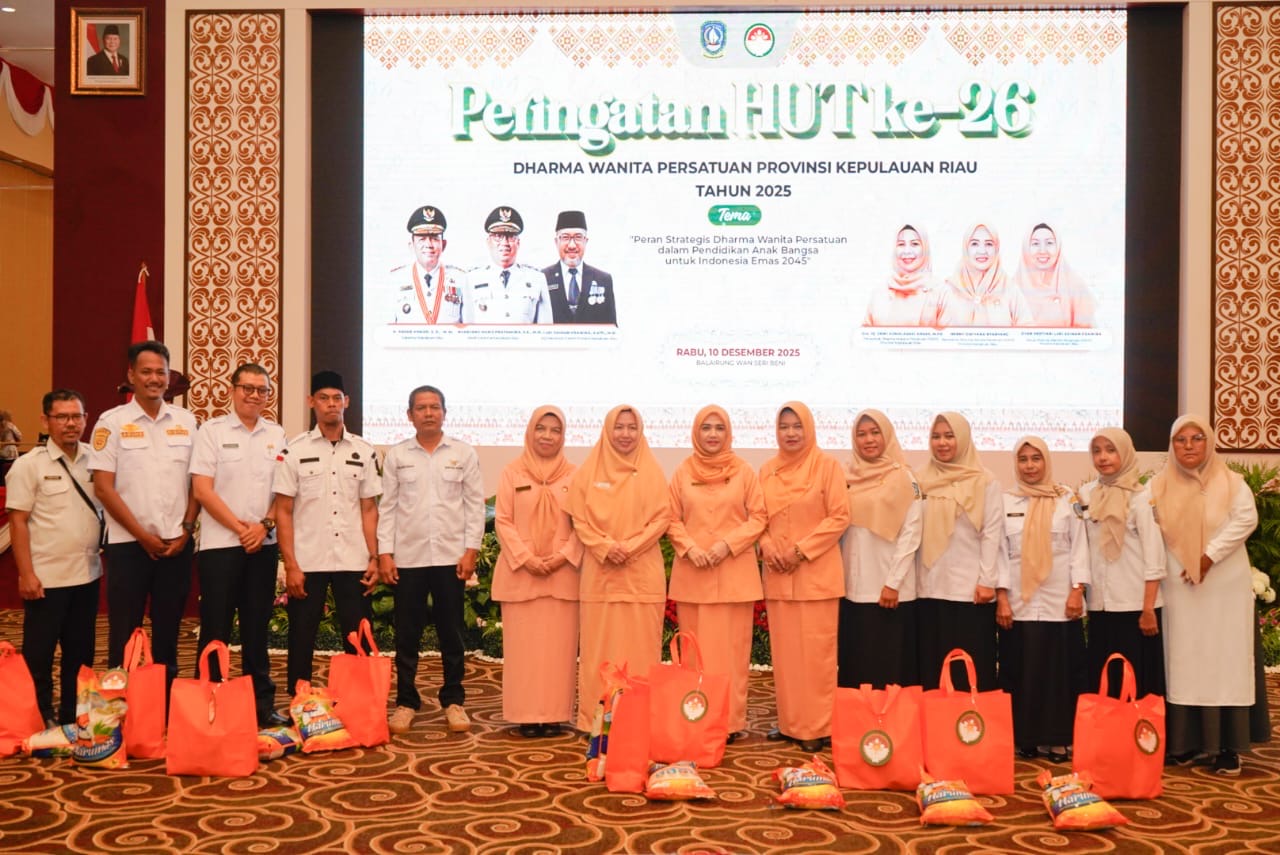 DISKOMINFO KEPRI - Penasehat Dharma Wanita Persatuan Provinsi Kepulauan Riau Nenny Dwiyana Nyanyang secara langsung menghadiri peringatan HUT ke-26 Dharma Wanita Persatuan Provinsi Kepri Tahun 2025 di Aula Balairung Wan Seri Beni Dompak, Rabu (10/12).